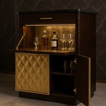 Elevate your interior with the Gatsby Bar Cabinet – a statement piece that blends timeless elegance with modern luxury. Crafted with a high gloss smoked eucalyptus veneer and adorned with liquid metal brass in a quilted pattern, Gatsby brings both warmth and sophistication to any space.